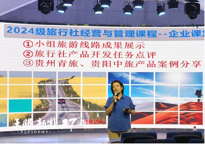 两位企业专家从行业视角对作品进行了专业点评。陈檀雅在肯定创意亮点的同时,指出了实操中的改进空间,并分享了贵阳中旅的成功案例,解析旅游产品从构思到落地的全过程。刘琴则引导学生深入思考旅游消费本质,从自然资源、民族特色等多维度重新认识贵州文旅价值,强调只有读懂贵州才能设计出打动人心的旅游产品。